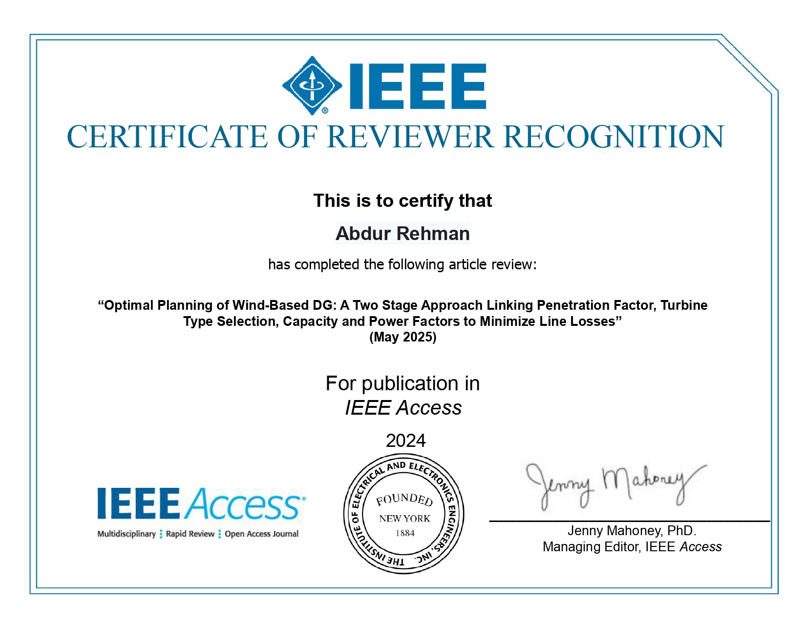 - The review of the article, “Optimal Planning of Wind-Based DG…”, showcases expertise in a specialized area of electrical engineering.